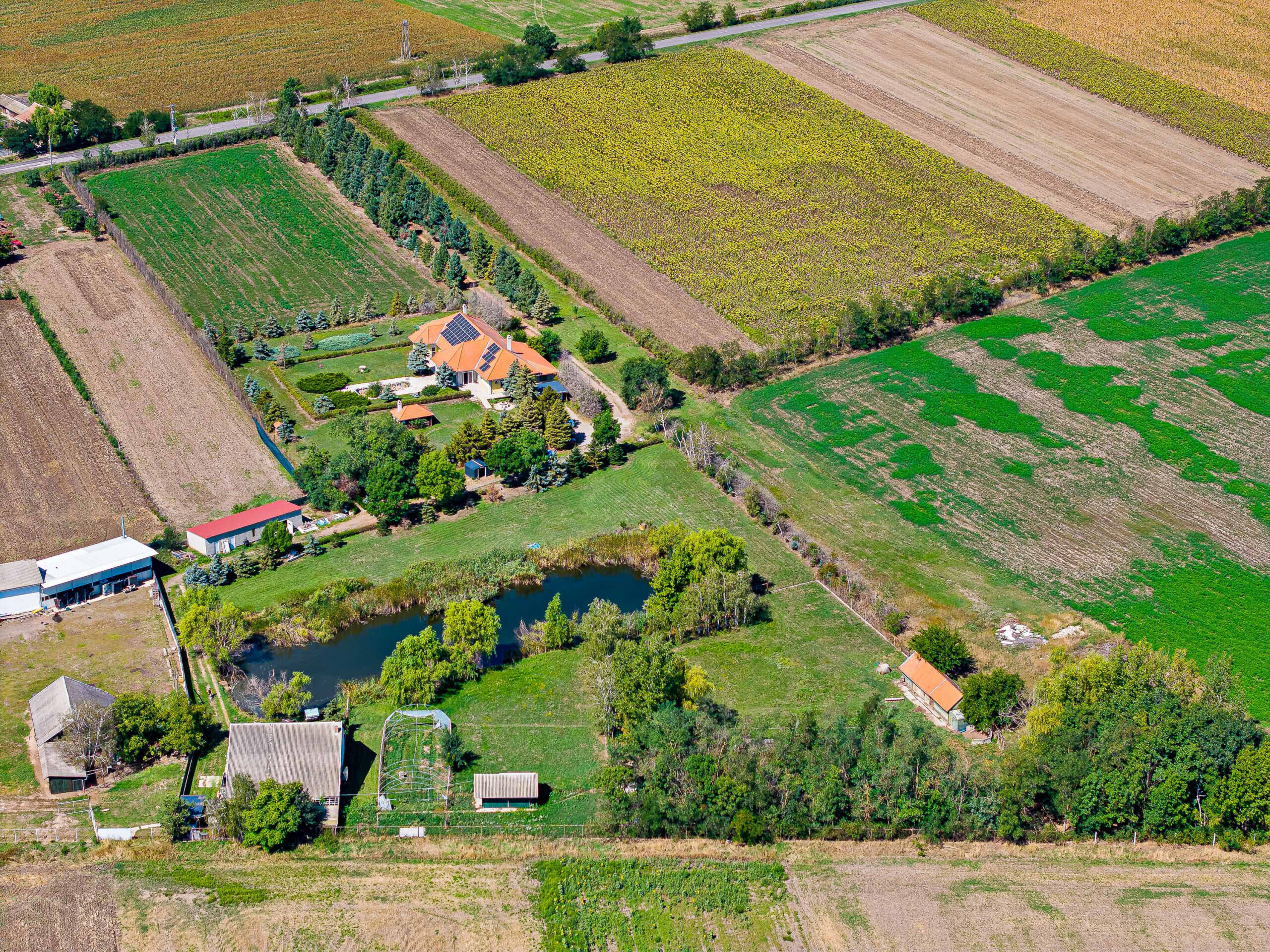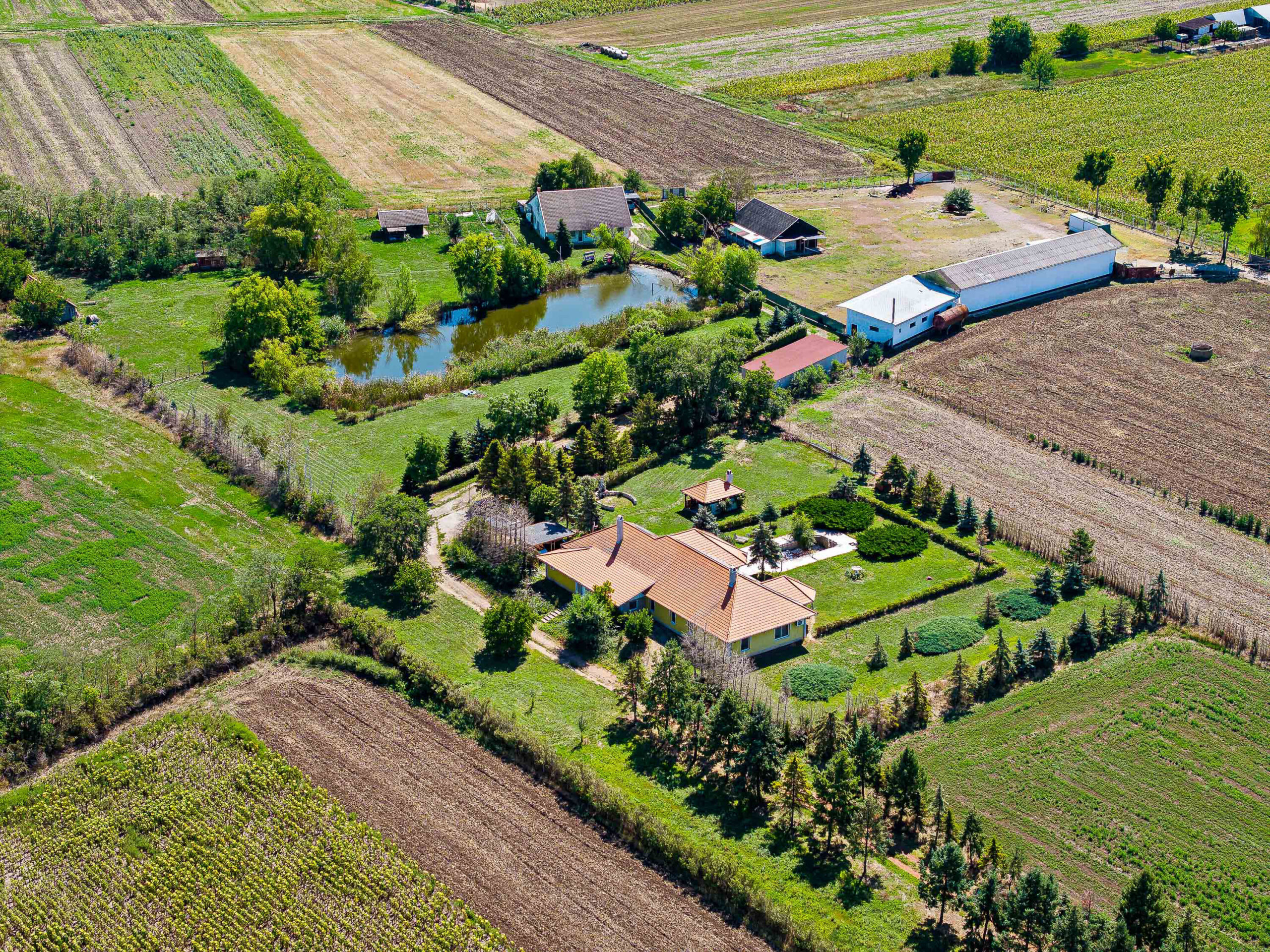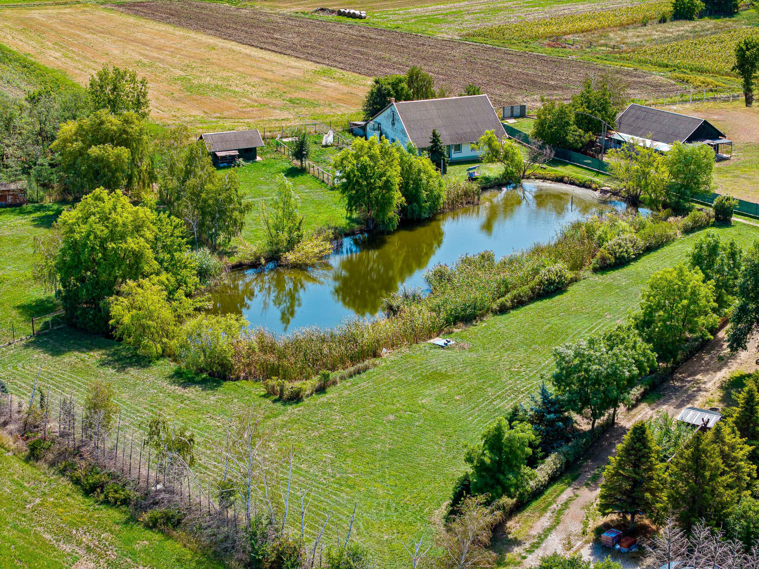 A 7,65 hektáros területen elhelyezkedik egy 320m2-es főépület, valamint egy 100m2-es tóparti ház, illetve 3 gazdasági épület, egy 5000m2-es tó és 4 hektár szántó passzív jövedelemként.