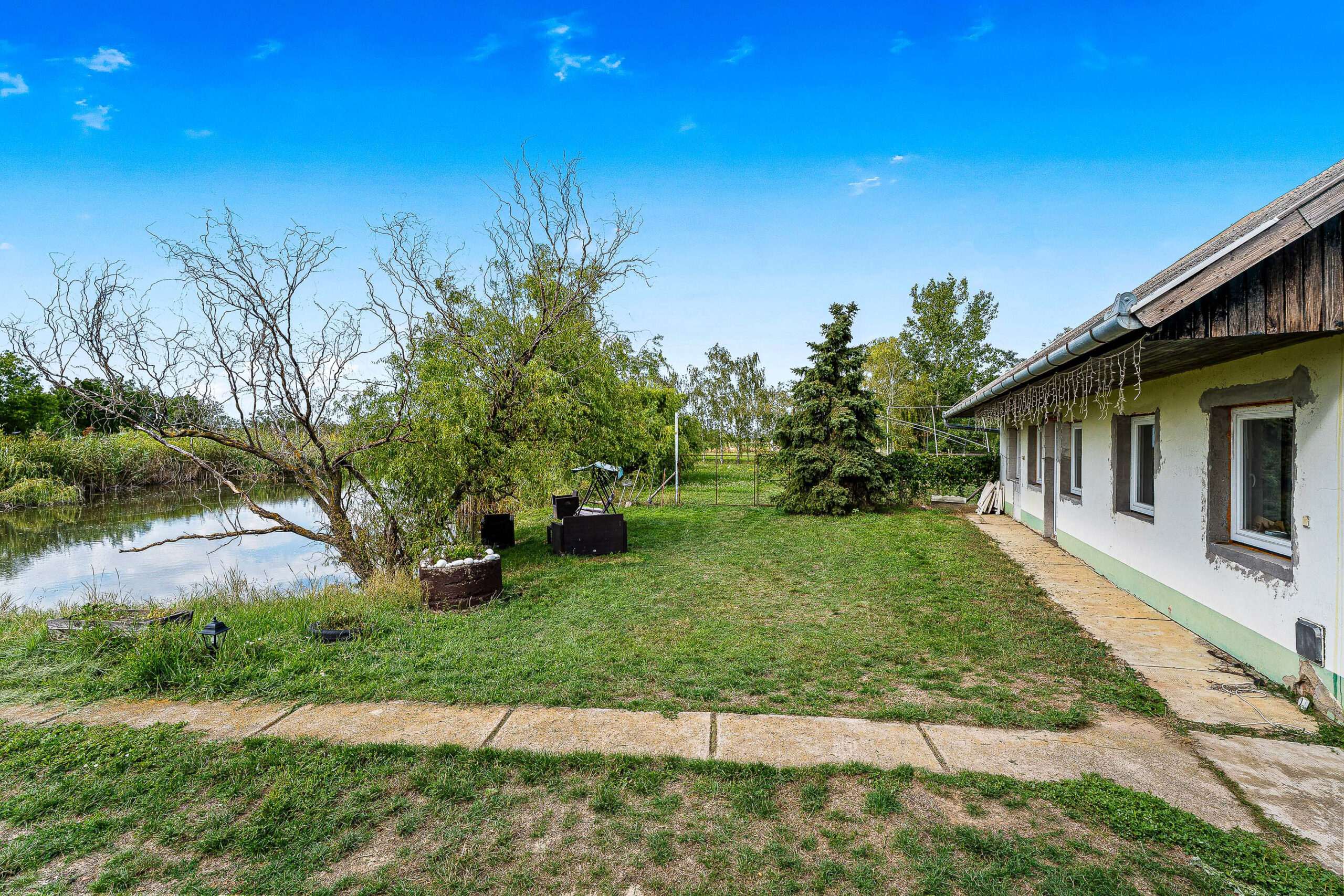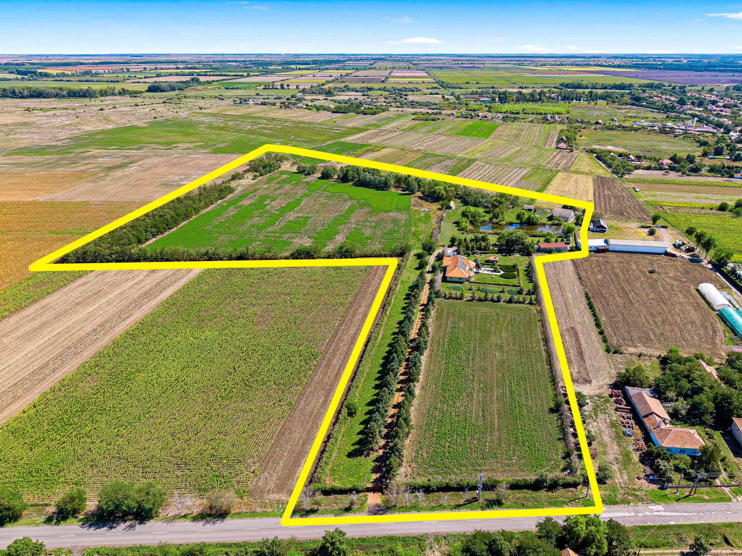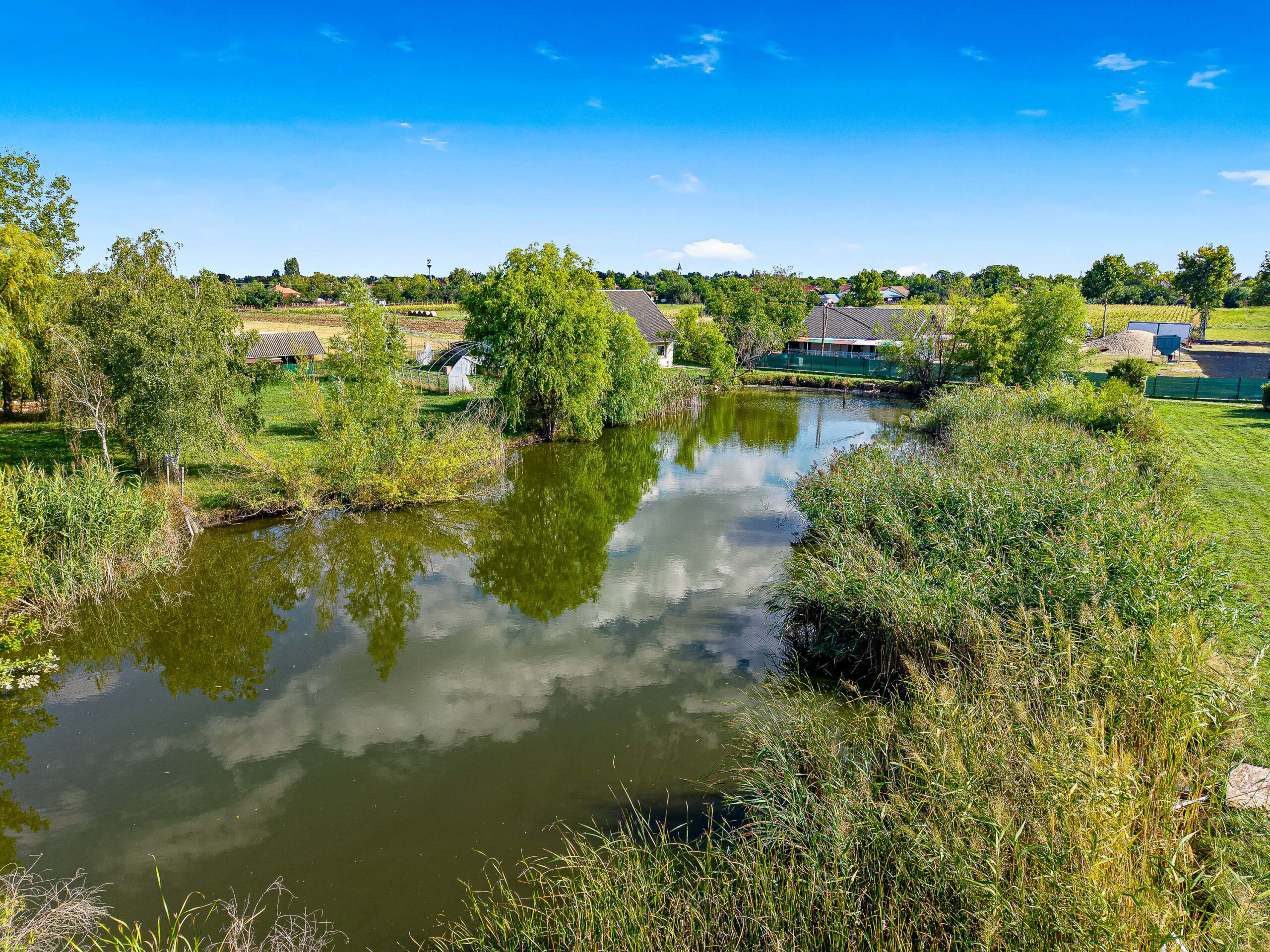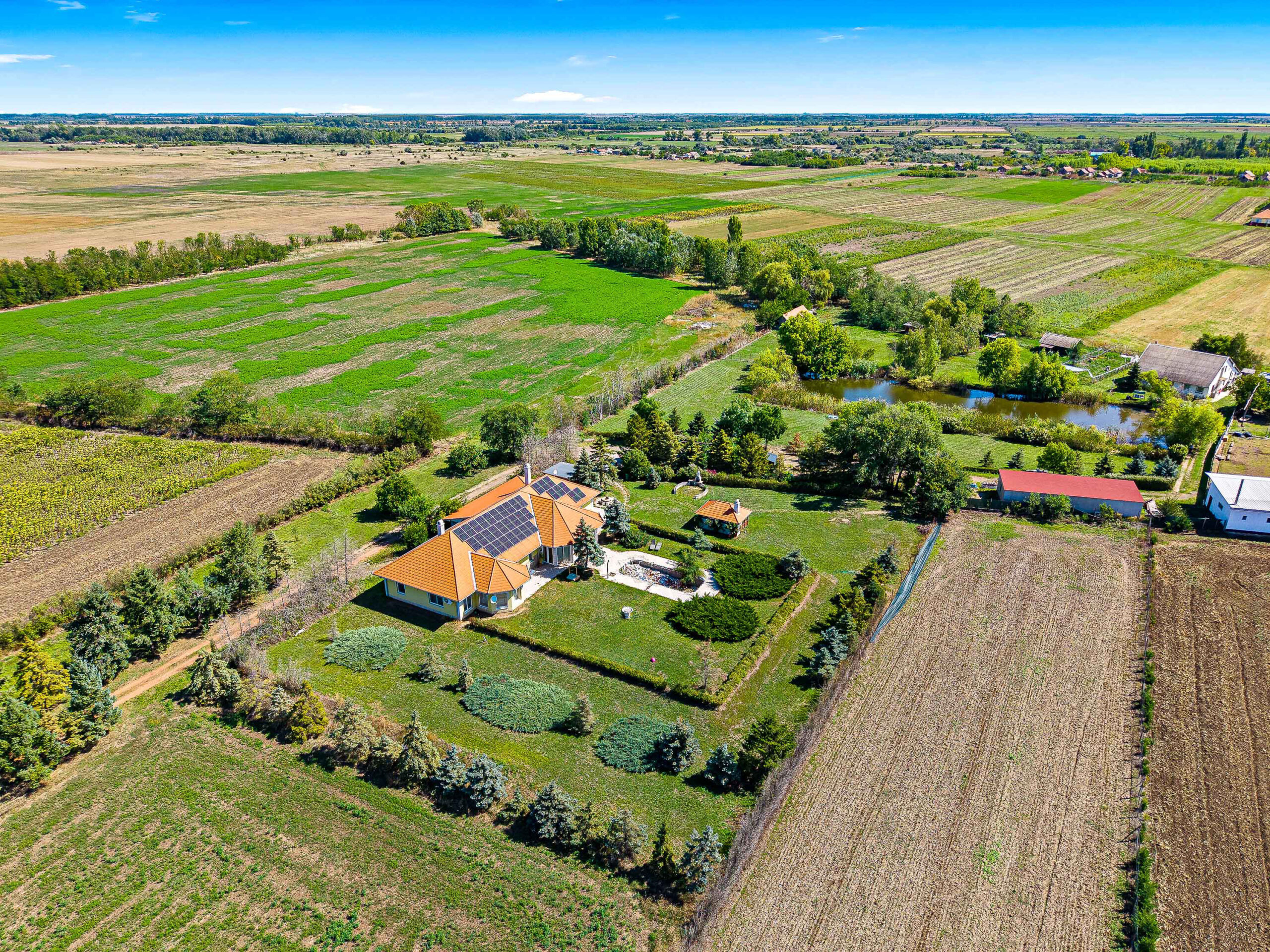 A 7,65 hektáros területen elhelyezkedik egy 320m2-es főépület, valamint egy 100m2-es tóparti ház, illetve 3 gazdasági épület, egy 5000m2-es tó és 4 hektár szántó passzív jövedelemként.