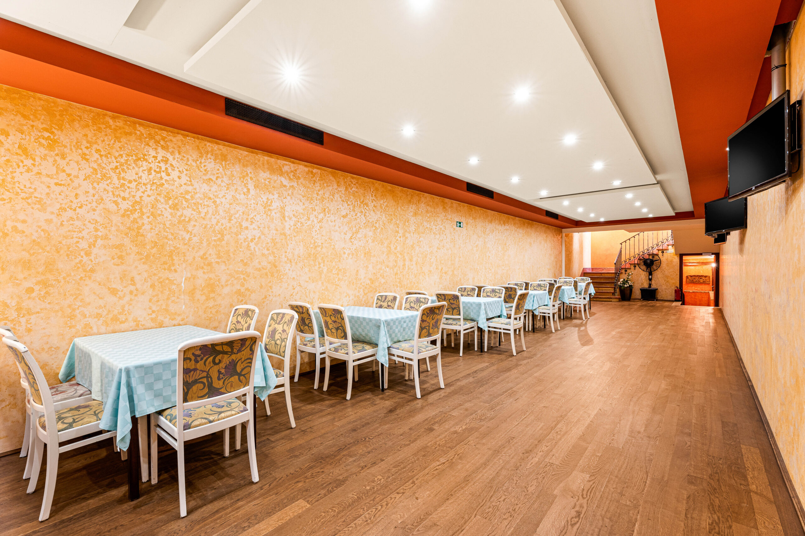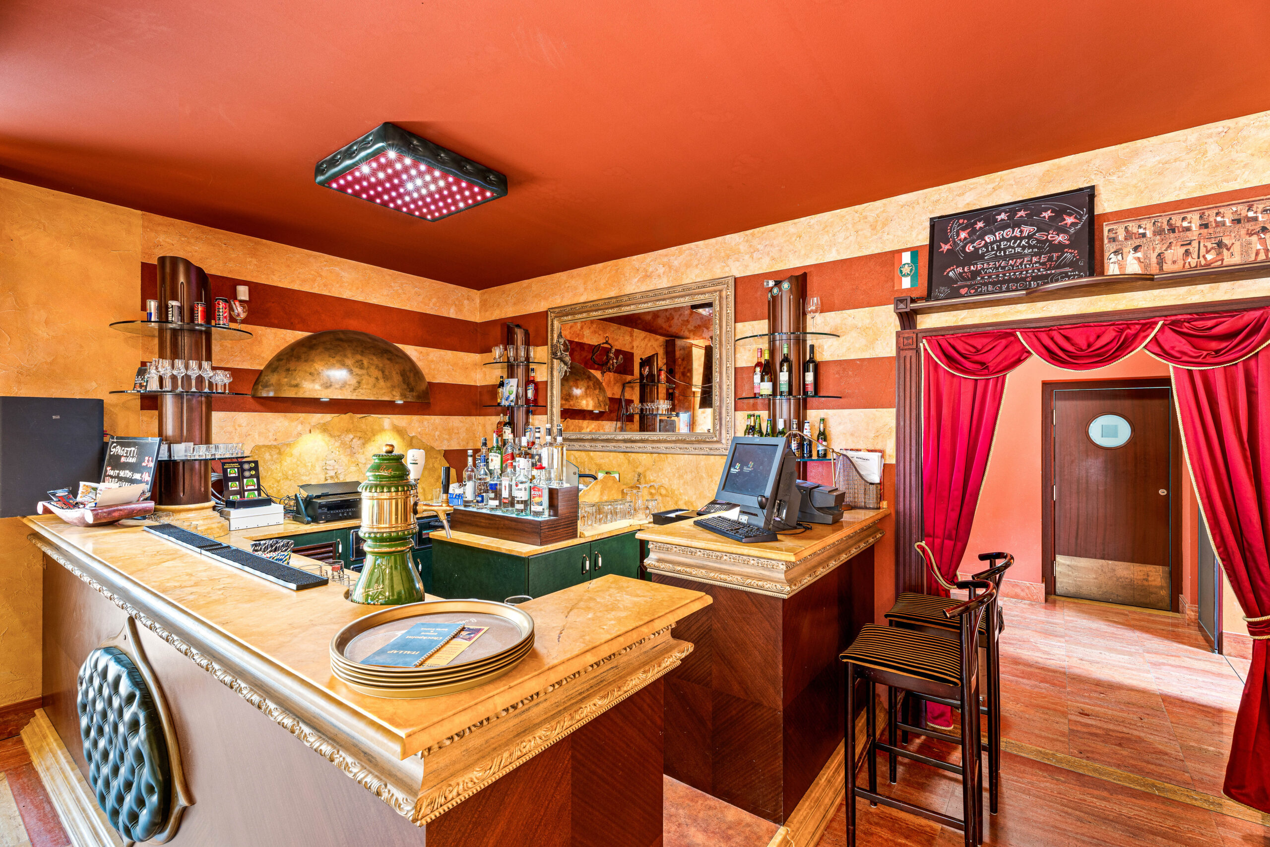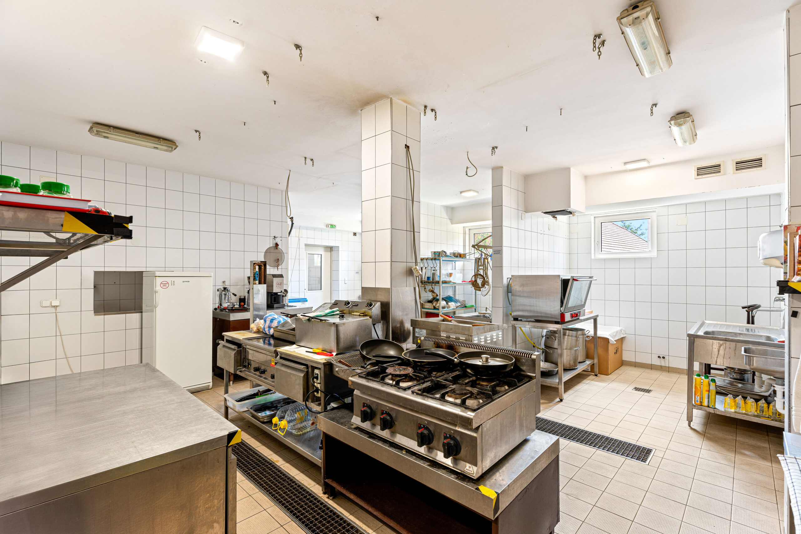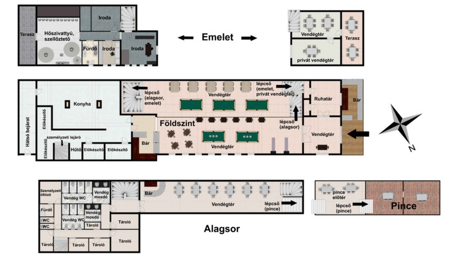 1000m2, amelyben 400m2 feletti vendégtér, mosdók, 100m2es konyha, kiszolgáló helyiségek, személyzeti részegek, tárolok és előkészítő helyiségek is rendelkezésre állnak.